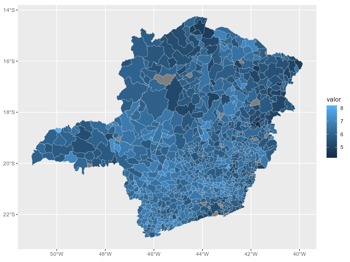 For a closer look, filter both datasets to a single state. Here we map IDEB across municipalities in Minas Gerais.