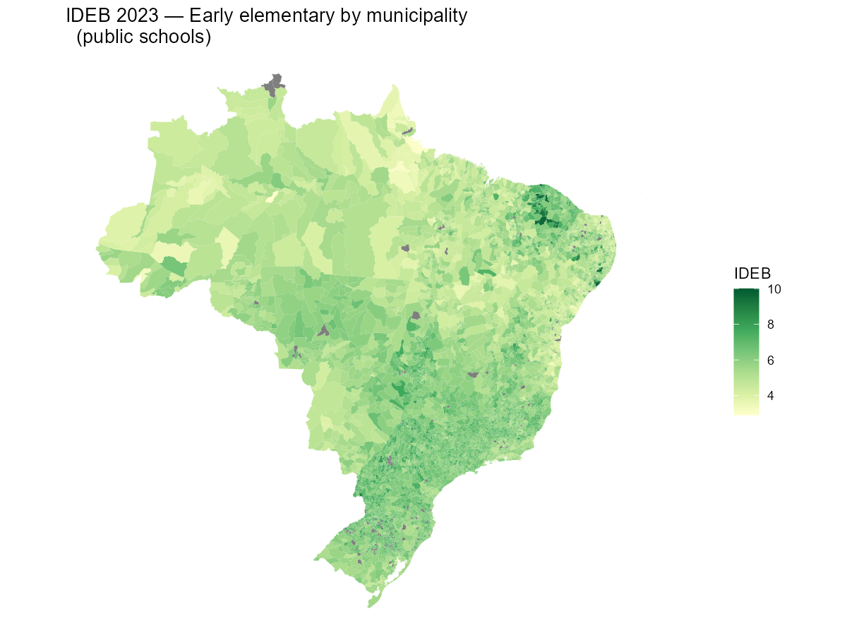 metric = "nota"to map SAEB proficiency scores instead of the composite IDEB. - Combine with other educabR datasets (ENEM, School Census) using the same municipality codes.