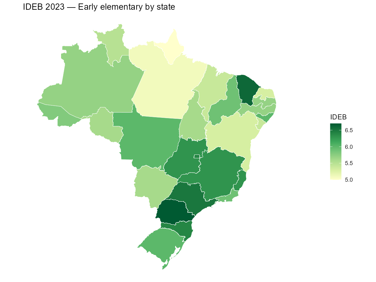 The simplest map uses state-level data. We download IDEB scores and join them with state geometries from geobr.