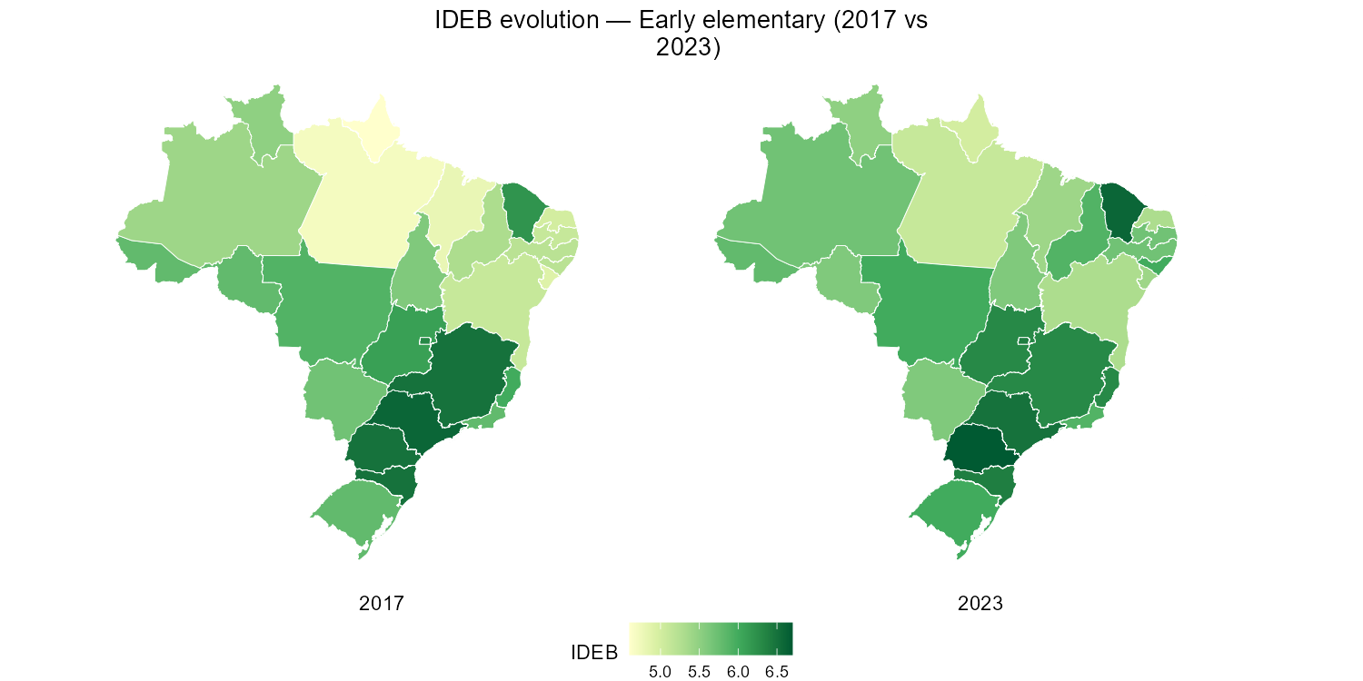 labs(title = "IDEB evolution — Early elementary (2017 vs 2023)") +
